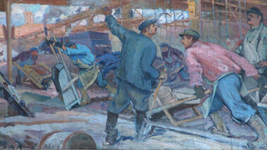 Картина М.С. Спиридонова (1890-1981) "Строительство вагоноремонтного завода" 1934 г. Холст, масло.