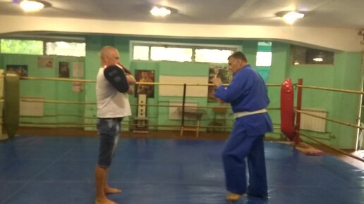Мне 62года. Вес 115кг. Моя растяжка позволяет легко наносить удары в голову. Разминка.