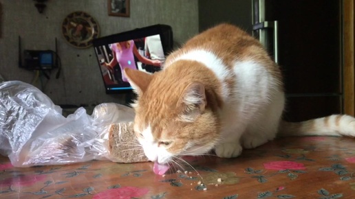 Кошка Рыся просит лапкой хлебушек . Наша толстенькая девочка