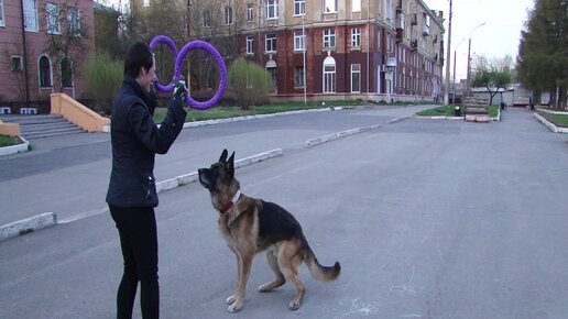 Далее: "Эрих, порычи!" Овчарка рычит и лает на палку.