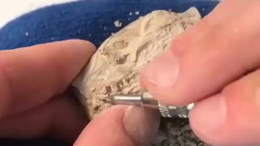 Палеонтолог очищает череп древнего млекопитающего от породы.