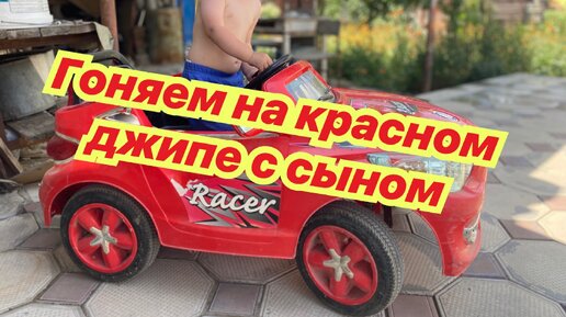 Сын первый раз катается на игрушечной машине.
