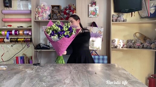 Букет ирисов и эустом в стильной упаковке💐
