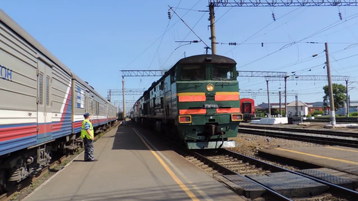 Опаздывающий на 1,5 часа пассажирский поезд Киров - Кисловодск под тягой грузового тепловоза