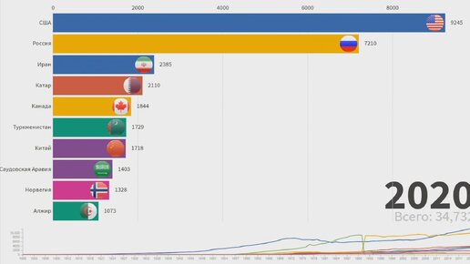 Топ-10 стран по добыче газа с 1922г-2020 г. (ТВт·ч/год)