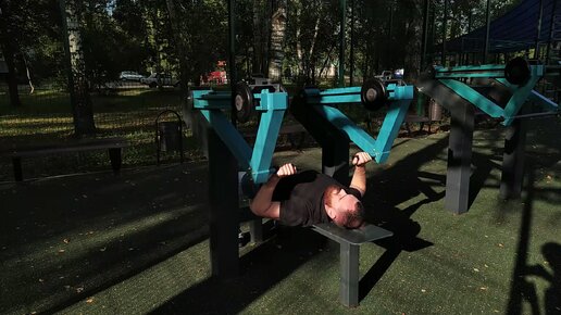 Тренировка грудных на уличном тренажёре.