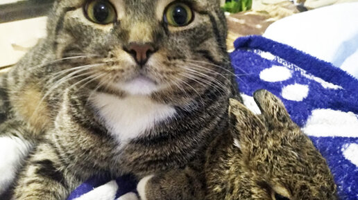 Заяц Шкварка считает котов за зайцев. Они его, похоже, за котенка...