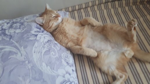Рыжий кот гуляет на поводке..