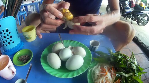 Самое необычное блюдо вьетнамской кухни, яйца "витлён". Утиное яйцо с утёнком внутри. Пробую в кафе на юге Вьетнама