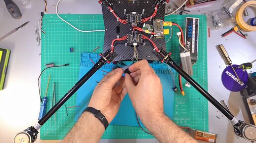 Монтаж силовой установки самодельного квадрокоптера и соединение электропроводки.
