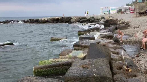 Женщина у волнорезов принимает массаж волнами Черного моря.