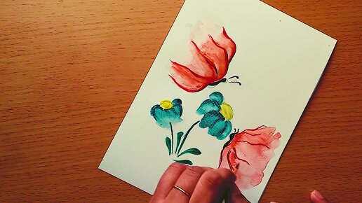 Рисую красных бабочек на голубых цветах акриловыми красками.