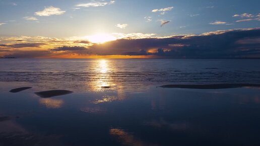 Закатное солнце отражается в зеркальной глади Финского залива через час после дождя. Ветерок создаёт небольшие аккуратные волны