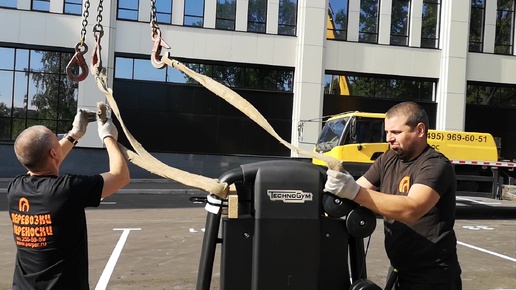 Доставка и подъем тренажеров с помощью крана в фитнес-клуб сети ДДХ БЦ «WestEast» Одинцово