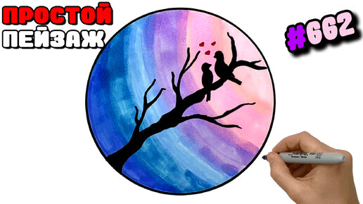 Рисуем просто красивый Пейзаж в Круге. Как нарисовать Пейзаж с Силуэтами Птиц очень легко.