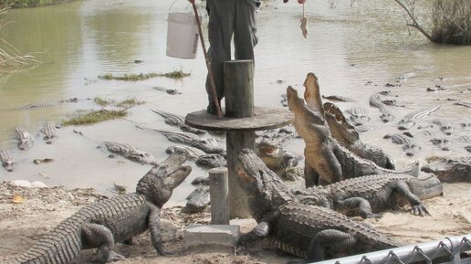 Кормление аллигаторов – работа для отважных. Ферма Эверглейдс. Флорида, США