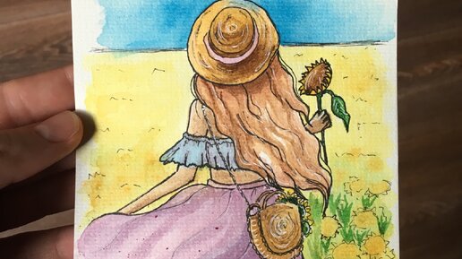 Вернулась к акварели после перерыва. Девушка в подсолнухах