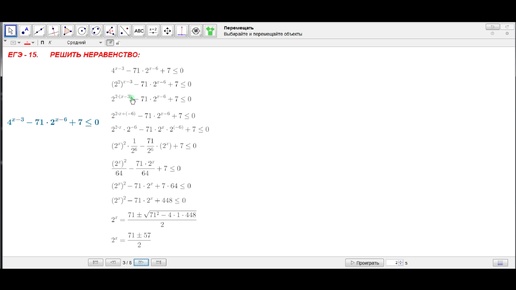 Далее: Решить неравенство 4^(x-3)-71*2^(x-6)+7<=0
