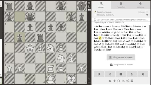 Роселли дель Турко (черные), совершает глупый зевок и получает красивый мат ферзем от Ефима Боголюбова в Праге, на турнире 1931