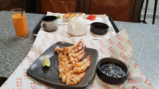 Мой обед в кафе Yes Pizza. Взяла тигровые креветки гриль и роллы