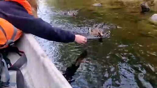 Кормим уток прям на ходу с лодки, они не отстают и кушают с рук