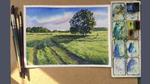 Уроки рисования. Как рисовать пейзаж акварелью. Рисуем акварелью простой пейзаж. Акварель для начинающих. Поэтапное рисование.
