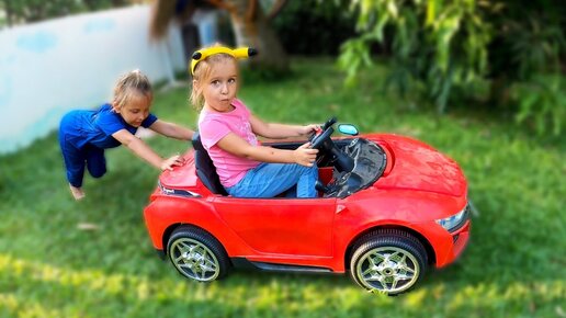 Мила и Ника катаются на машинке. Дети катаются и чинят красную машинку.
