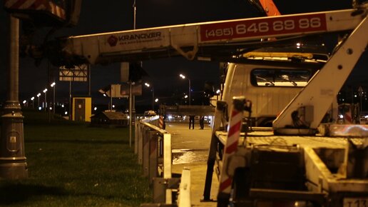 Автовышка в дождь устанавливает стелу