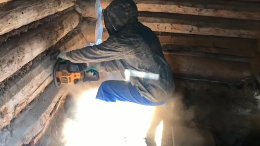Пилим Нижний ряд брёвен у дома