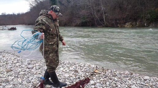 Рыбалка кастинговой сетью зимой на горной реке