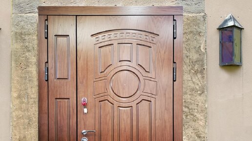 Двустворчатая металлическая дверь с отделкой МДФ с простым и красивым рисунком на панели.