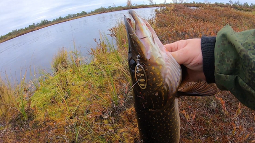 На диком озере, где почти не ступала нога человека, бронзовая щука хватает из под берега