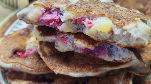 Яблочные оладьи - много яблок, мало муки и чуть-чуть малины для аромата.