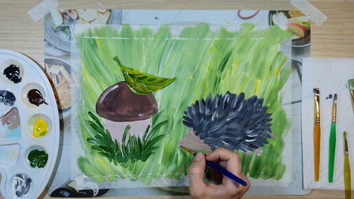 🎨Лесная картинка для детей от 5 лет - Ёжик и грибочек (гуашь)
