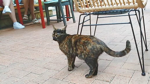 Чудо-Кошка с необычной расцветкой и жёлтыми глазами в кафе