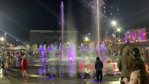 Катались с сестрой на велосипедах и попали на вечернюю световую программу фонтана.