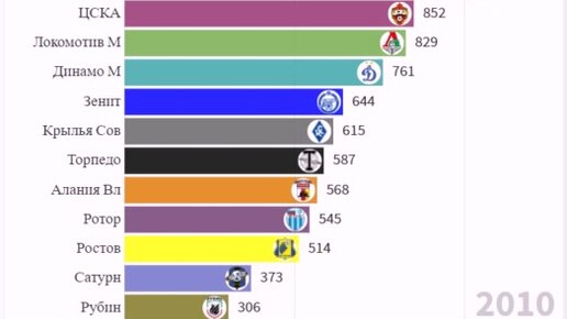 Топ-12 лучших клубов России по количеству забитых мячей в РПЛ с 1992 года.