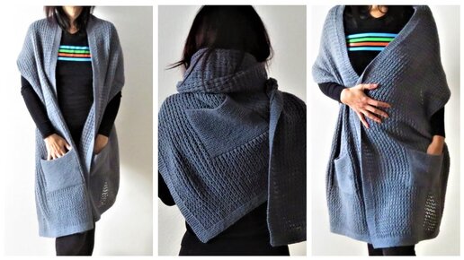 ПРЯМОУГОЛЬНИК + 2 КВАДРАТА .ПАЛАНТИН СПИЦАМИ.СТИЛЬНЫЙ,УДОБНЫЙ ,МНОГОФУНКЦИОНАЛЬНЫЙ ШАРФ С КАРМАНАМИ