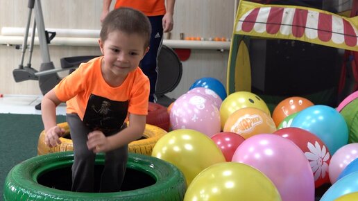 Цветные шарики шины и туннель устроили соревнования с ребенком