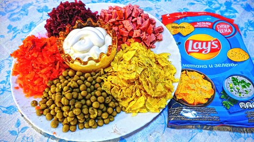 Мама приготовила салат с чипсами,свеклой,зеленым горошком морковью