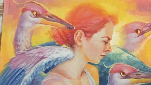 Процесс рисования иллюстрации гуашью и цветными карандашами