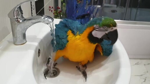 Прикольный попугай АРА купается. Смешной попугай.