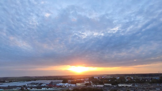 В небе лёгкие пушистые облака на ярком закате.