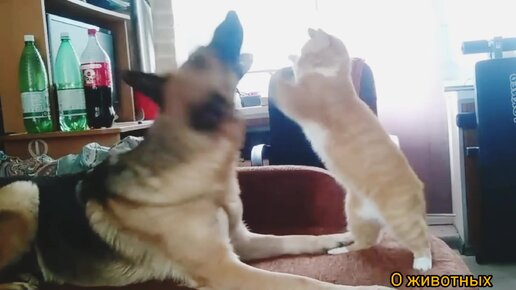 Дружеский бой немецкой овчарки и кота, кот даёт отпор!