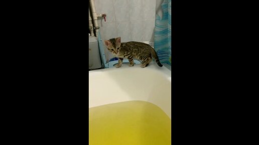 Бенгал ходит по краю ванны. Искупнется или нет?