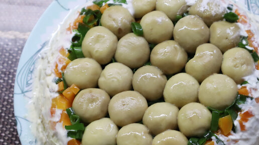Салат, который готовлю "вверх ногами": Грибная полянка с курицей и овощами