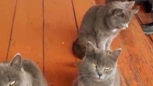 Кошки сидят на крыльце и переговариваются с хозяйкой.