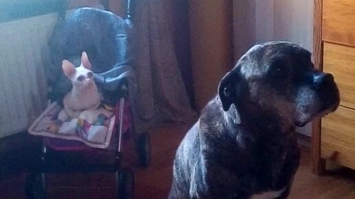 Хвост виляет серьезной собакой. Кот с квадратными глазами смотрит на неё. Смотрите видео