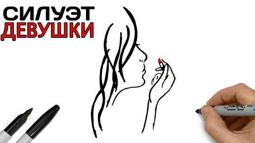 Как нарисовать силуэт девушки черным маркером с красной помадой в руке.