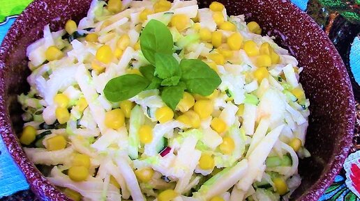 Просто вкусный салат из пекинской капусты, сельдерея, кукурузы и яблока.